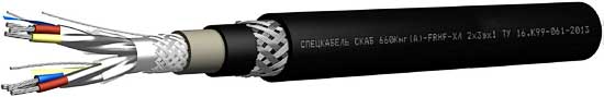| Тройки с многопроволочными медными лужеными жилами сечением от 0,5 до 2,5 мм² с изоляцией из огнестойкой кремнийорганической резины, в индивидуальном экране из алюмолавсановой ленты с контактным проводником из медной лужёной проволоки; общий экран из алюмолавсановой ленты с контактным проводником из медной лужёной проволоки и в оплётке из медных лужёных проволок плотностью 40%. Оболочка из ПВХ пластиката пониженной пожароопасности (СКАБ 660Кнг (А)-FRLS), полимерной композиции, не содержащей галогенов (СКАБ 660Кнг (А)-FRHF-ХЛ) или безгалогенного термопластичного полиуретана (СКАБ 660КУнг©-FRHF-ХЛ). Броня в виде оплетки из стальных оцинкованных проволок. Защитный шланг из ПВХ пластиката пониженной пожароопасности (СКАБ 660Кнг (А)-FRLS), полимерной композиции, не содержащей галогенов (СКАБ 660Кнг (А)-FRHF-ХЛ) или безгалогенного термопластичного полиуретана (СКАБ 660КУнг©-FRHF-ХЛ). |