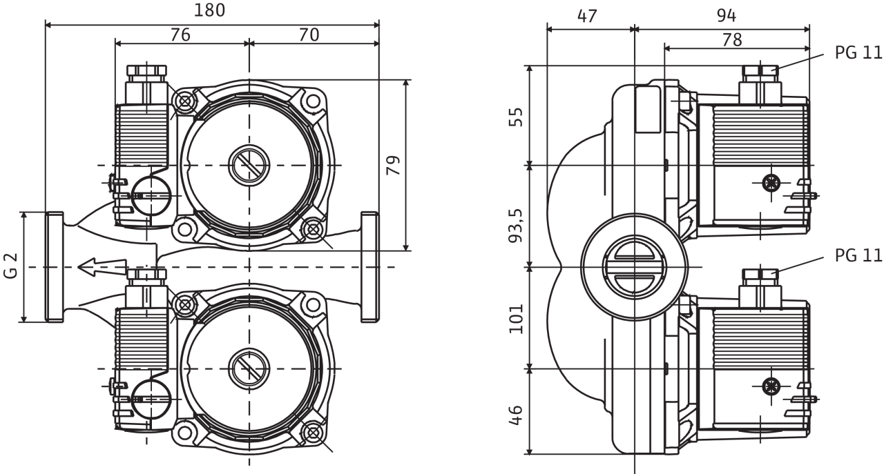 Сдвоенный насос с мокрым ротором в общем корпусе с перекидным клапаном для установки в трубах. С ручным трехступенчатым переключением частоты вращения. Устойчивый к токам блокировки электродвигатель. Корпус насоса из серого чугуна, рабочее колесо из полипропилена, вал из нержавеющей стали с угольными подшипниками скольжения с металлической пропиткой.