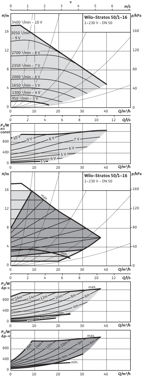 Минимальное давление на входе при температурах жидкости 50/95/110В°C7 / 15 / 23 м