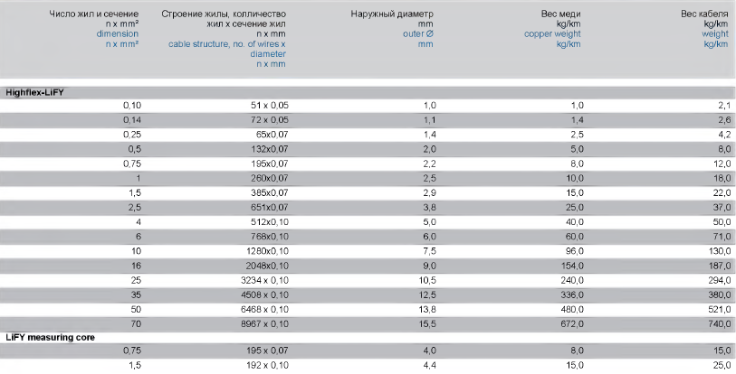1.000 V для LiFY- измерительная жила; 500 V- особо гибкие жилы LiFY до 1mm2; 750 V- от 1,5 mm2 |