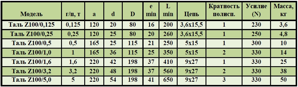 Таль ручная шестеренная серия Z100 предназначена для подъема, удержания в поднятом положении и опускания груза массой, не превышающей грузоподъемность тали. При комплектовании тали механизмом передвижения данная таль может применяться также и для перемещения груза по монорельсовому пути двутаврового профиля. Таль может эксплуатироваться как в закрытом помещении, так и на открытом воздухе при температуре от –20С° до +40С°. Запрещается применение талей для подъема людей, взрывоопасных или ядовитых веществ, жидкого или раскаленного металла и шлака; эксплуатация в химически активных средах.