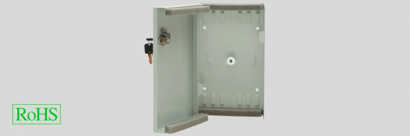 Cabinet with hinged cover, lockable, 2 keys, 2 dust-proof openings for incoming and outgoing cables that are fixed in place with cable ties. Space for a maximum of 4 splice trays or 1 splice tray and a distribution plate. Dimensions: Width = 265 x Height = 150 x Depth = 55mm. Included in delivery: 1 x distribution plate for 8 x ST or 8 x FC(D-hole) connecters and 1 x distribution plate for 4 x SC Duplex or 4 x LC 4-Way connectors.