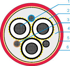 Жилы управления (3) | Дополнительно; лужёная медь, тонкожильная, класс 5 в соответствии с DIN VDE 0295, изоляция из этиленпропиленового