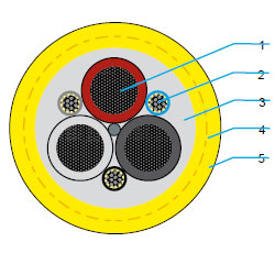 Внешняя оболочка (5) | Смесь из хлорированного каучука 5GM5, желтая, износостойкая и устойчиваяк разрыву, стойкая к воздействию масел, нераспространяет горение, толщина стенки: 5,0 мм.