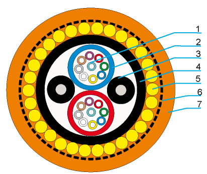 Данный тип кабеля предназначен для передачи оптических сигналов и информации в усложненных условиях, а также при принудительной направляющей укладке, напр., на барабанах, траверсах, тележках и т. д. при очень высоких механических нагрузках, на открытом воздухе, а также в сухих и влажных помещениях и на взрывоопасных участках.Устройство