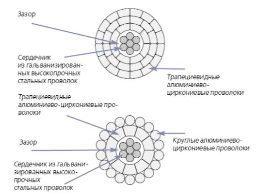 В конструкции проводов проводов с зазором используется несколько слоев трапециевидных термостойких алюминий-циркониевых проволок, расположенных вокруг высокопрочного стального сердечника. Чтобы обеспечить свободу движения проволок вокруг сердечника, внешний диаметр сердечника делают не-много меньше, чем внутренний диаметр полого прово-да. Данный «зазор» становится неотъемлемой частью провода и обеспечивает ему особые характеристики.