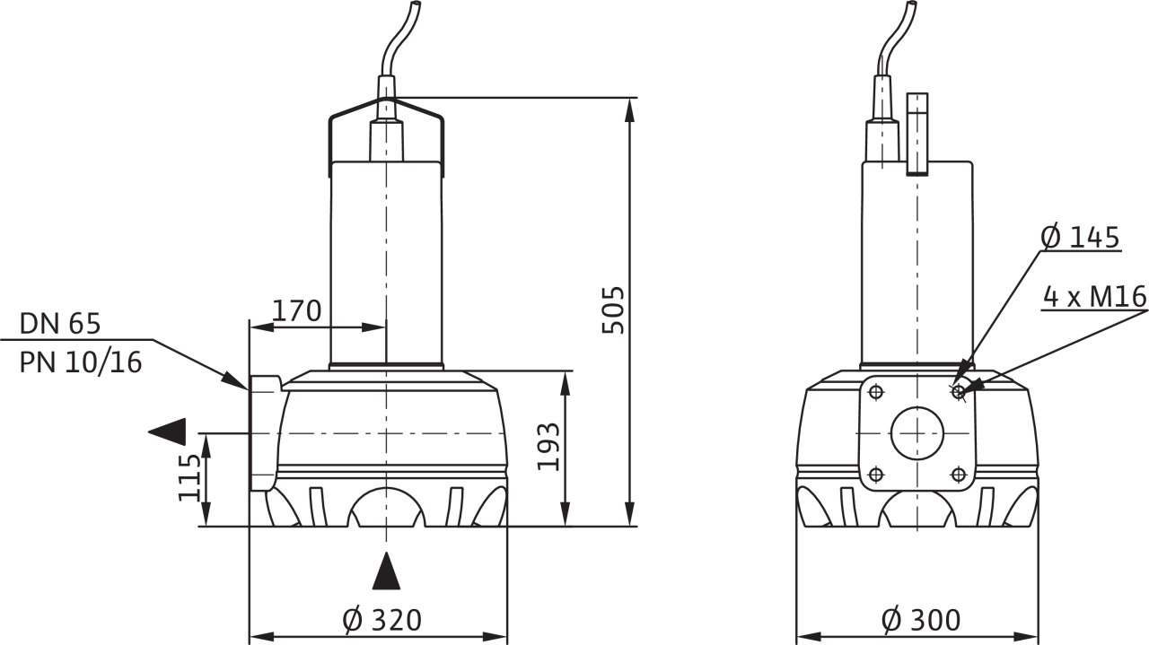 Полностью погружной дренажный насос для отвода сточных вод в виде блочного агрегата для вертикальной установки в погруженном состоянии для перекачивания загрязненной воды. Гидравлический корпус и рабочее колесо из синтетического материала, корпус электродвигателя из нержавеющей стали. Напорный патрубок с горизонтальным напорным патрубком и фланцевым соединением. Электродвигатель насоса с сухим ротором в исполнении для трехфазного тока с защитой от перегрева и разъемным соединительным кабелем длиной 10 м со свободным концом. Все агрегаты серийно со взрывозащитой.