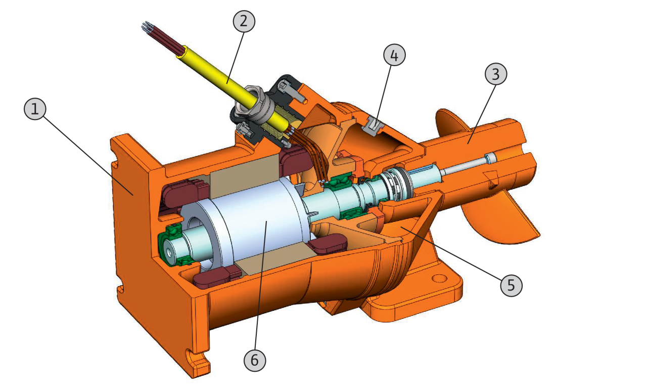 1 = присоединительный фланец для рамы или настенного крепления, 2 = кабель, 3 = пропеллер, 4 = винты слива масла и маслоналивные пробки, а также устройство контроля герметичности камеры уплотнений (в качестве опции), 5 = камера уплотнений, 6 = электродвигатель