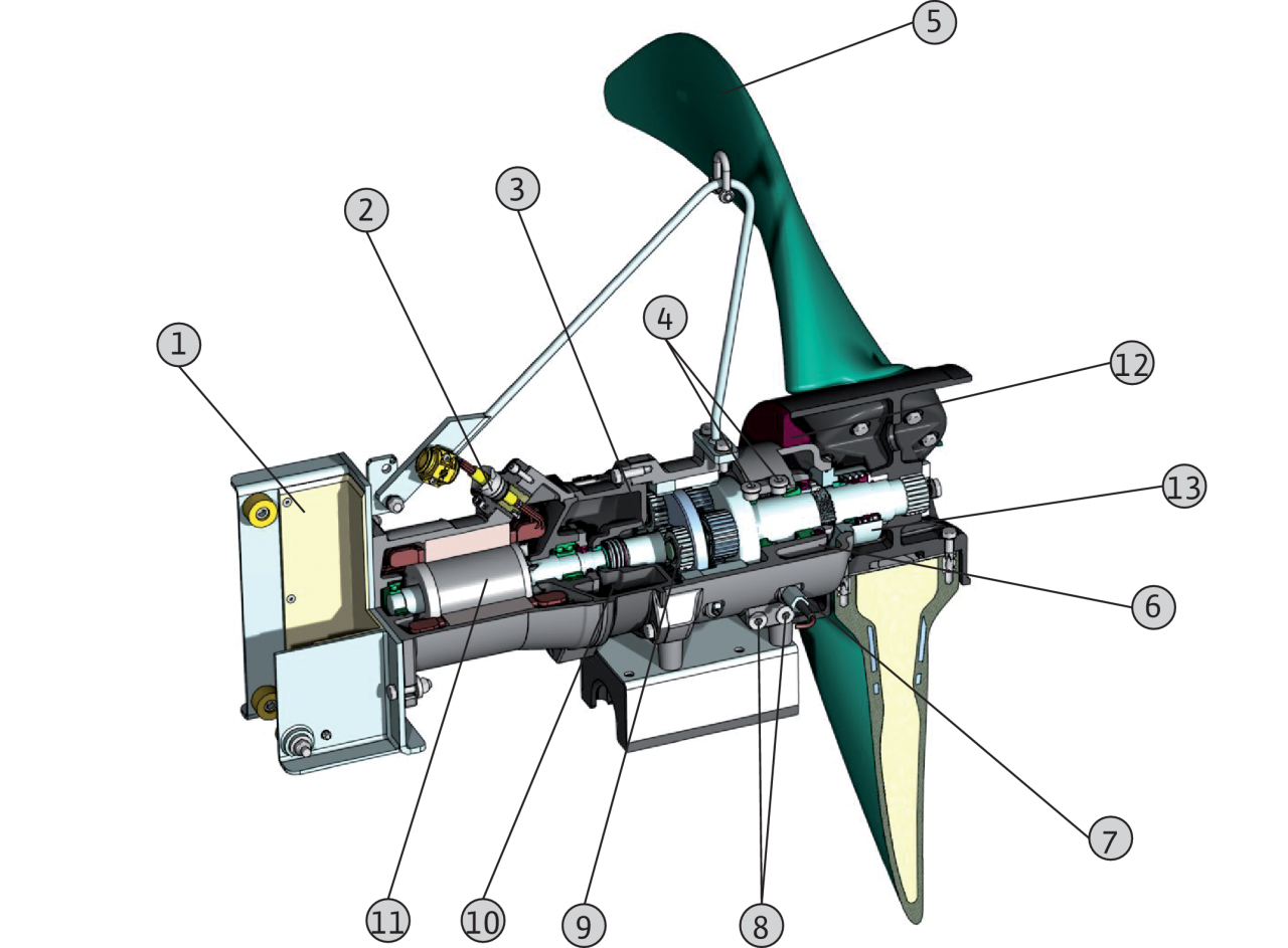 1 = рама, 2 = кабель, 3 = камера привода, 4 = маслоналивные пробки, 5 = пропеллер, 6 = форкамера, 7 = устройство контроля герметичности камеры уплотнений (в качестве опции), 8 = винты слива масла, 9 = планетарный редуктор, 10 = камера уплотнений, 11 = электродвигатель, 12 = уплотняющее кольцо ступицы (в качестве опции), 13 = защитное кольцо