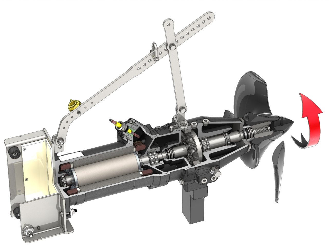 1 = рама, 2 = кабель, 3 = камера привода, 4 = маслоналивные пробки, 5 = пропеллер, 6 = форкамера, 7 = устройство контроля герметичности камеры уплотнений (в качестве опции), 8 = винты слива масла, 9 = планетарный редуктор, 10 = камера уплотнений, 11 = электродвигатель