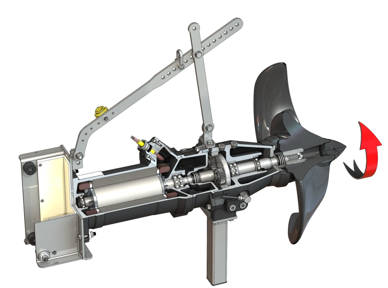 1 = рама, 2 = кабель, 3 = камера привода, 4 = маслоналивные пробки, 5 = пропеллер, 6 = форкамера, 7 = устройство контроля герметичности камеры уплотнений (в качестве опции), 8 = винты слива масла, 9 = планетарный редуктор, 10 = камера уплотнений, 11 = электродвигатель