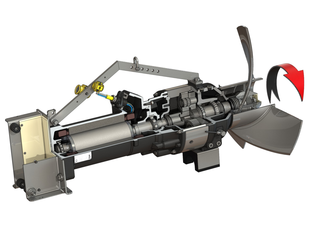 1 = рама, 2 = кабель, 3 = камера привода, 4 = маслоналивные пробки, 5 = пропеллер, 6 = форкамера, 7 = устройство контроля герметичности камеры уплотнений (в качестве опции), 8 = винты слива масла, 9 = планетарный редуктор, 10 = камера уплотнений, 11 = электродвигатель