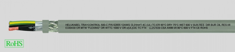 HELUKABEL® TRAYCONTROL 500-C — гибкий экранированный и маслостойкий кабель управления. Особое сочетание TC-ER, PLTC-ER и ITC-ER позволяет применять его в качестве постоянно подвижного кабеля подключения для промышленных машин и установок согл. NFPA 79 2007. Разрешён для открытой прокладки от кабельного лотка до оборудования. Отличная маслостойкость, OIL RES I & II, гарантирует длительный срок службы при промышленном использовании в сухих и влажных средах. Рекомендуемые области применения: производственные линии, разливочные установки, машиностроение, распределительные шкафы, конвейеры, упаковочные машины, автомобильная промышленность.