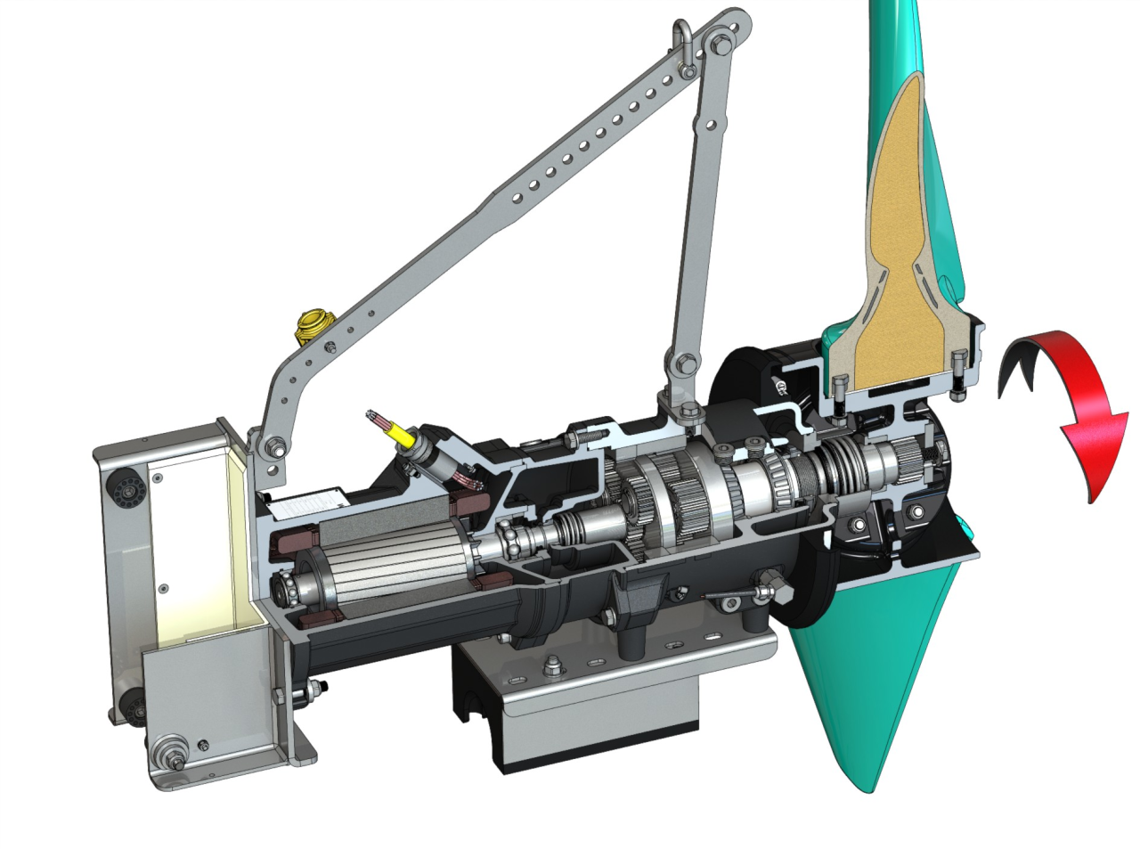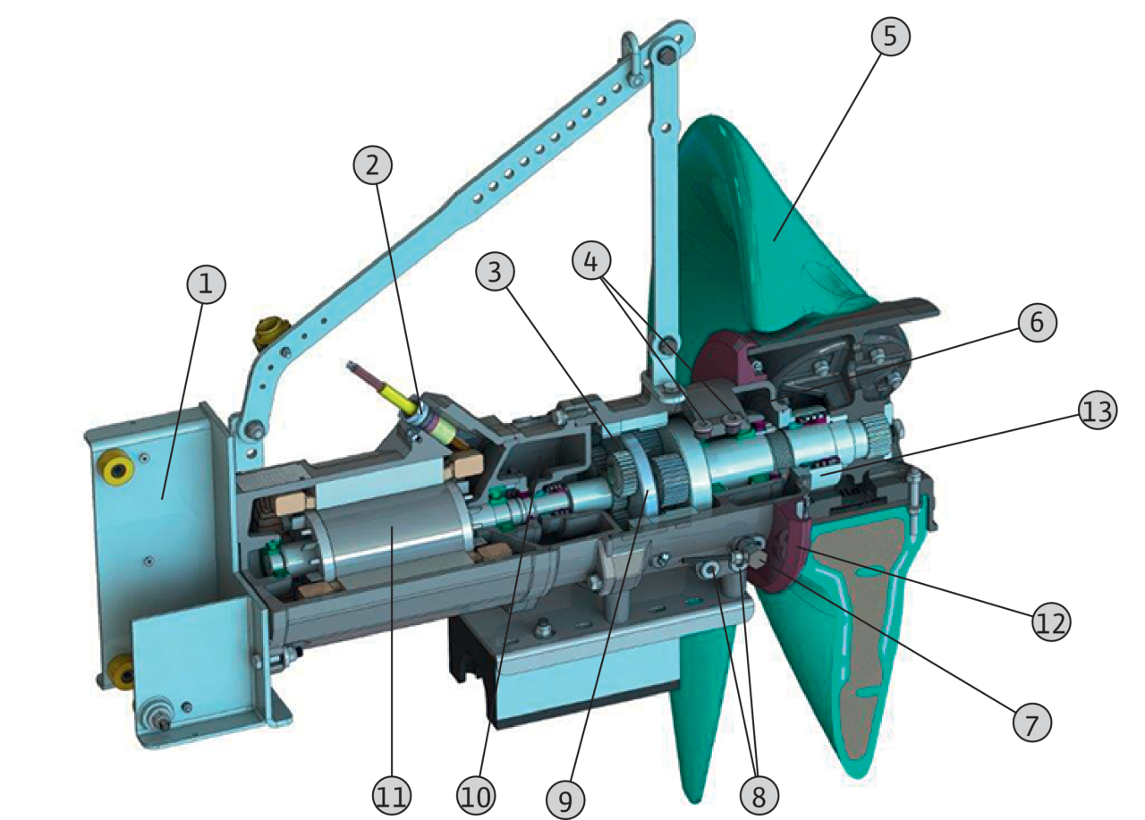 1 = рама, 2 = кабель, 3 = камера привода, 4 = маслоналивные пробки, 5 = пропеллер, 6 = форкамера, 7 = устройство контроля герметичности камеры уплотнений (в качестве опции), 8 = винты слива масла, 9 = планетарный редуктор, 10 = камера уплотнений, 11 = электродвигатель, 12 = уплотняющее кольцо ступицы (в качестве опции), 13 = защитное кольцо