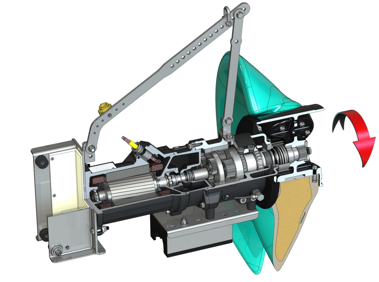 1 = рама, 2 = кабель, 3 = камера привода, 4 = маслоналивные пробки, 5 = пропеллер, 6 = форкамера, 7 = устройство контроля герметичности камеры уплотнений (в качестве опции), 8 = винты слива масла, 9 = планетарный редуктор, 10 = камера уплотнений, 11 = электродвигатель, 12 = уплотняющее кольцо ступицы (в качестве опции), 13 = защитное кольцо