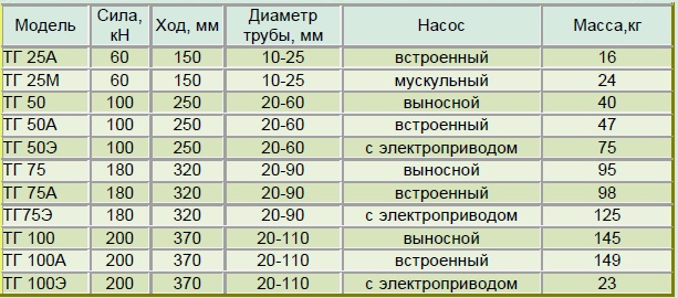 Трубогибы ТГ25А,ТГ25М,ТГ50,ТГ50А,ТГ50Э,ТГ75,ТГ75А,ТГ75Э,ТГ 100, ТГ100А и ТГ100Э - серийно выпускаемые модели Привод от ручного насоса, встроенный и от насосной станции.