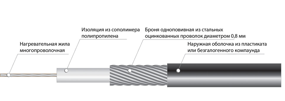 Секция нагревательная кабельная с проволочной броней и оболочкой для обогрева лестниц, площадок, дорог, плоских кровель, желобов, капельников