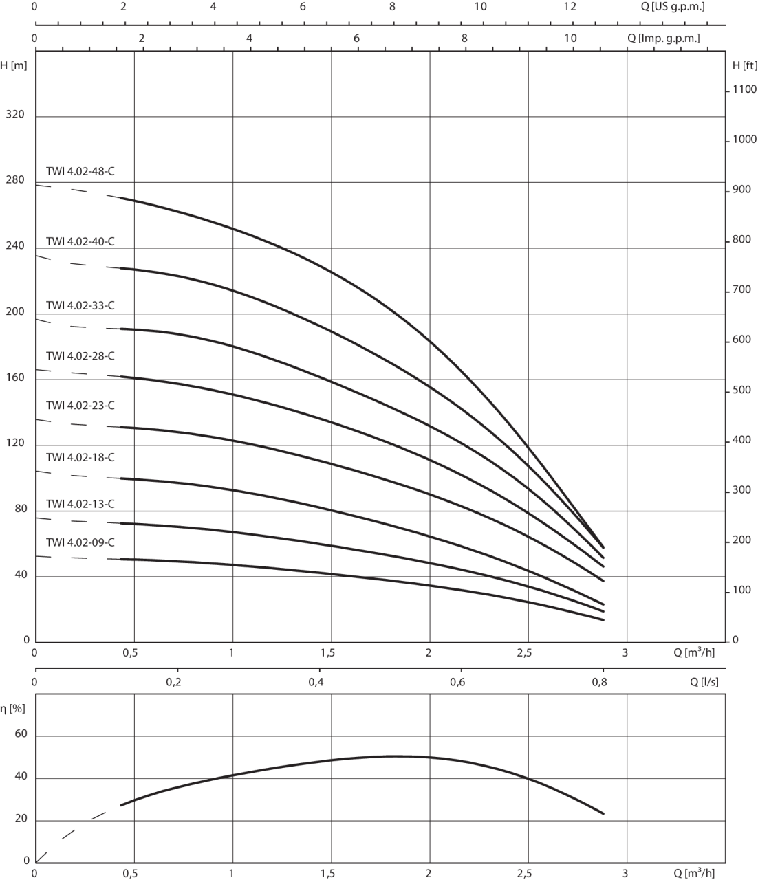 3~400 В, 50 Гц, p = 1 кг/дм3, v = 1x10-6 м2/с, ISO 9906 приложение A, η = КПД насоса