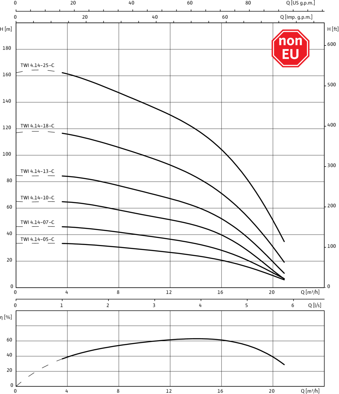 3~400 В, 50 Гц, p = 1 кг/дм3, v = 1x10-6 м2/с, ISO 9906 приложение A, η = КПД насоса