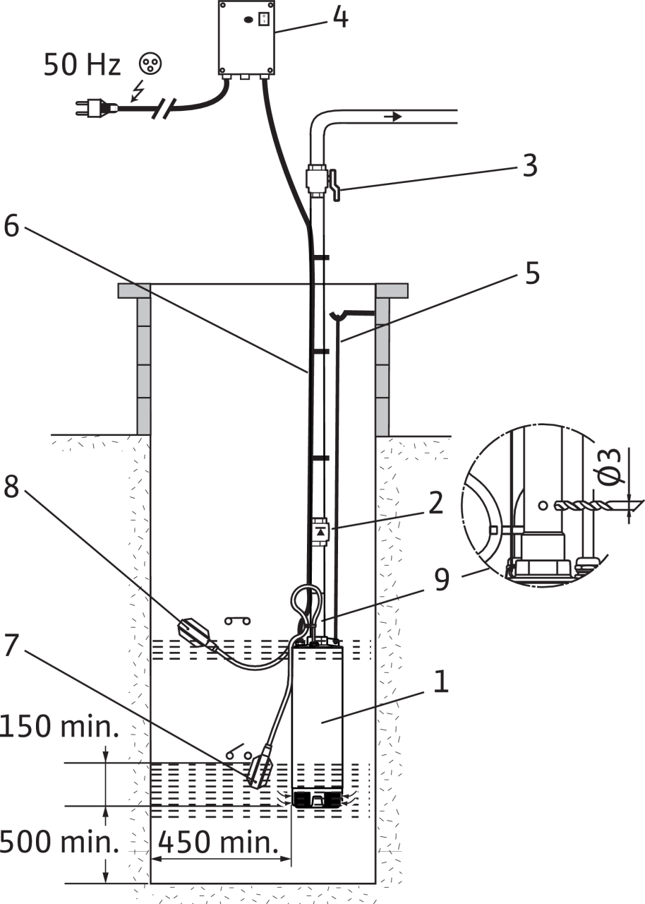 Насос в однофазном исполнении с соединительным кабелем, распределительной коробкой (IP55) с устройством защитой электродвигателя от перегрева, выключателем питания, а также с соединительным кабелем длиной 2 м, который снабжен штекером с защитным контактом. Возможна эксплуатация в непогруженном состоянии.