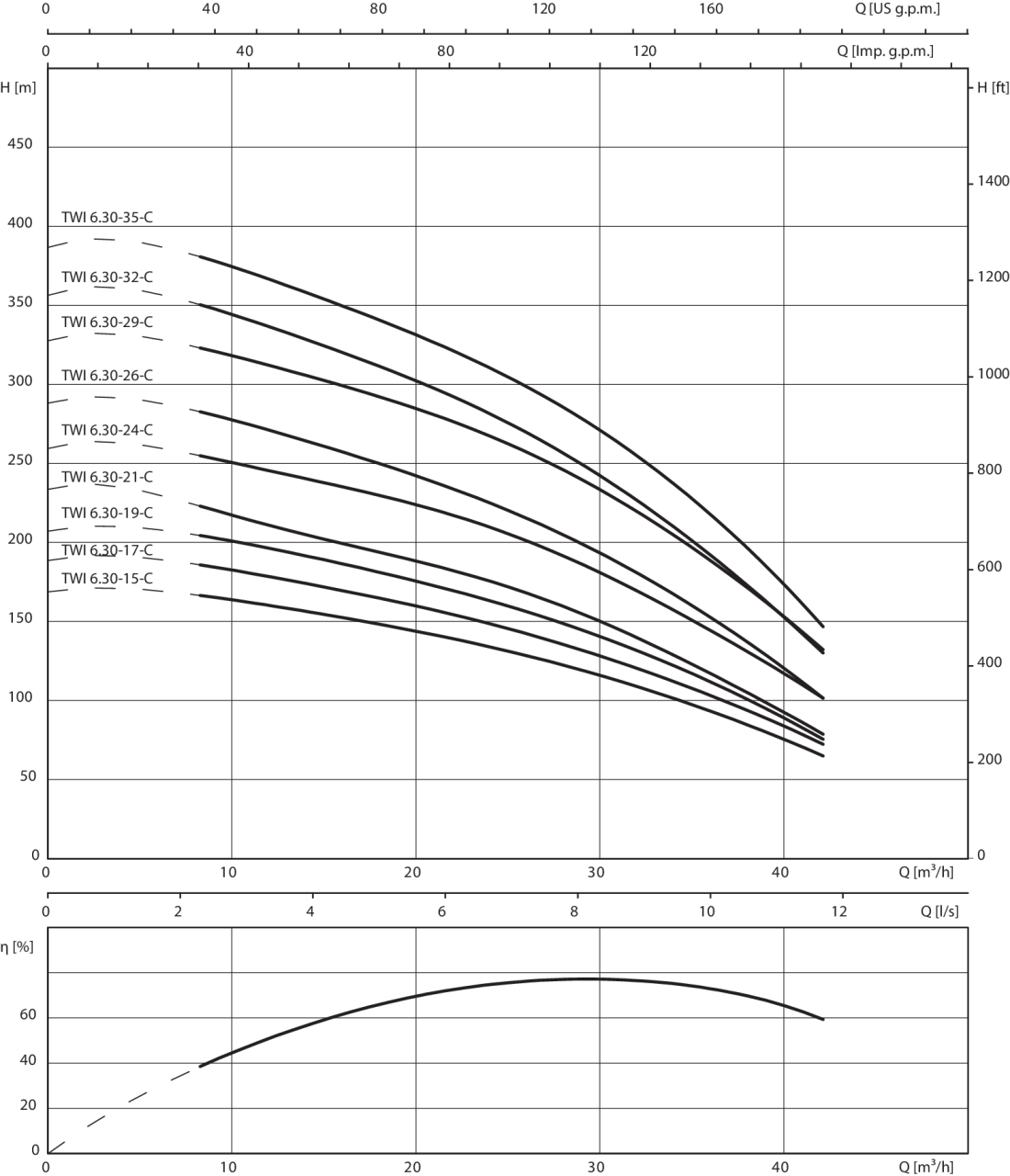 3~400 В, 50 Гц, p = 1 кг/дм3, v = 1x10--6 м2/с, ISO 9906 приложение A