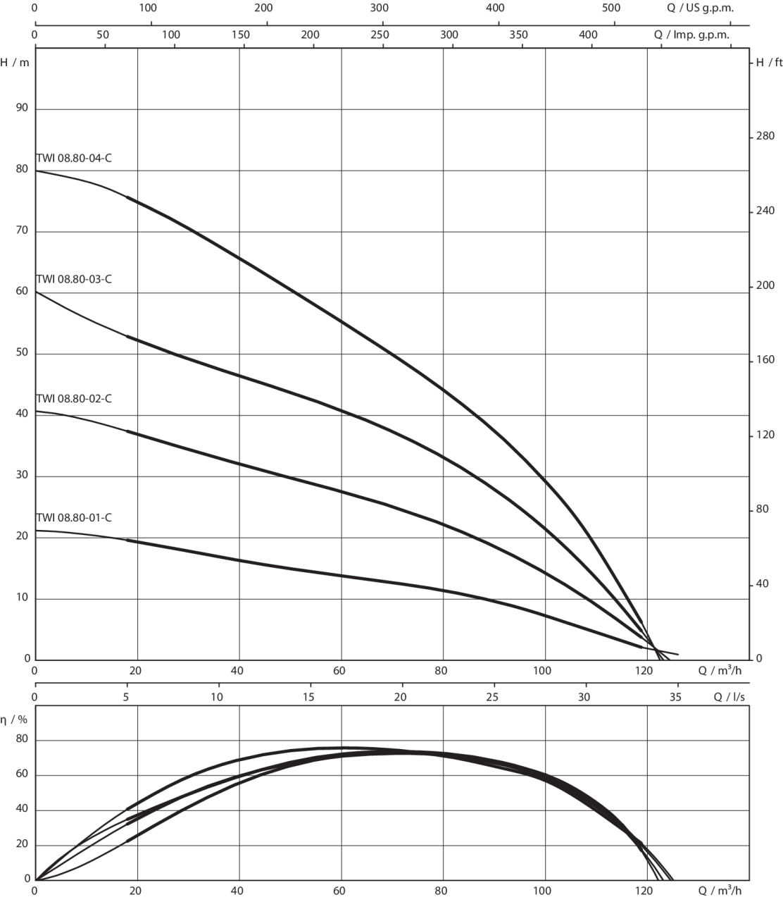 3~400 В, 50 Гц, p = 1 кг/дм3, v = 1x10-6 м2/с, ISO 9906 приложение A