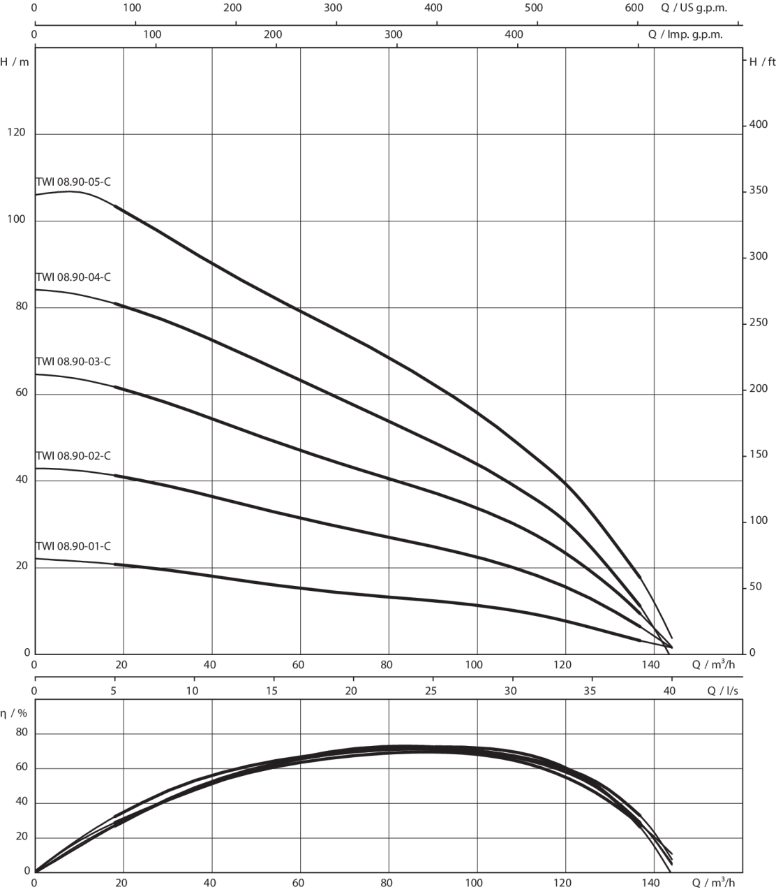 3~400 В, 50 Гц, p = 1 кг/дм3, v = 1x10-6 м2/с, ISO 9906 приложение A