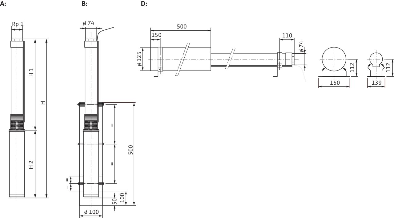 Полностью погружной многоступенчатый насос с радиальными рабочими колесами. Применяется при работе с грунтовыми водами из скважин; максимальная глубина погружения 150 м, максимальное содержание песка 50 г/м3.