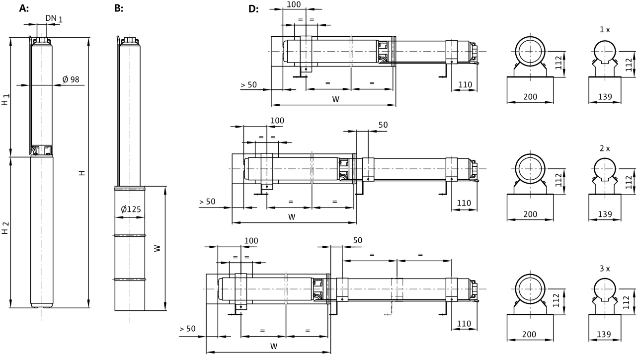 A = вертикальный, B = вертикальный с охлаждающим кожухом, D = горизонтальный с охлаждающим кожухом