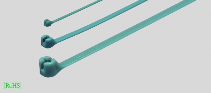 TY-RAP® cable tie with steel lug lock made of corrosion-resistant, non-magnetic steel. This technology enables the tie to offer excellent binding properties even under the most rigorous conditions such as heat, cold, humidity etc. and makes it insensitive to vibrations and external influences.