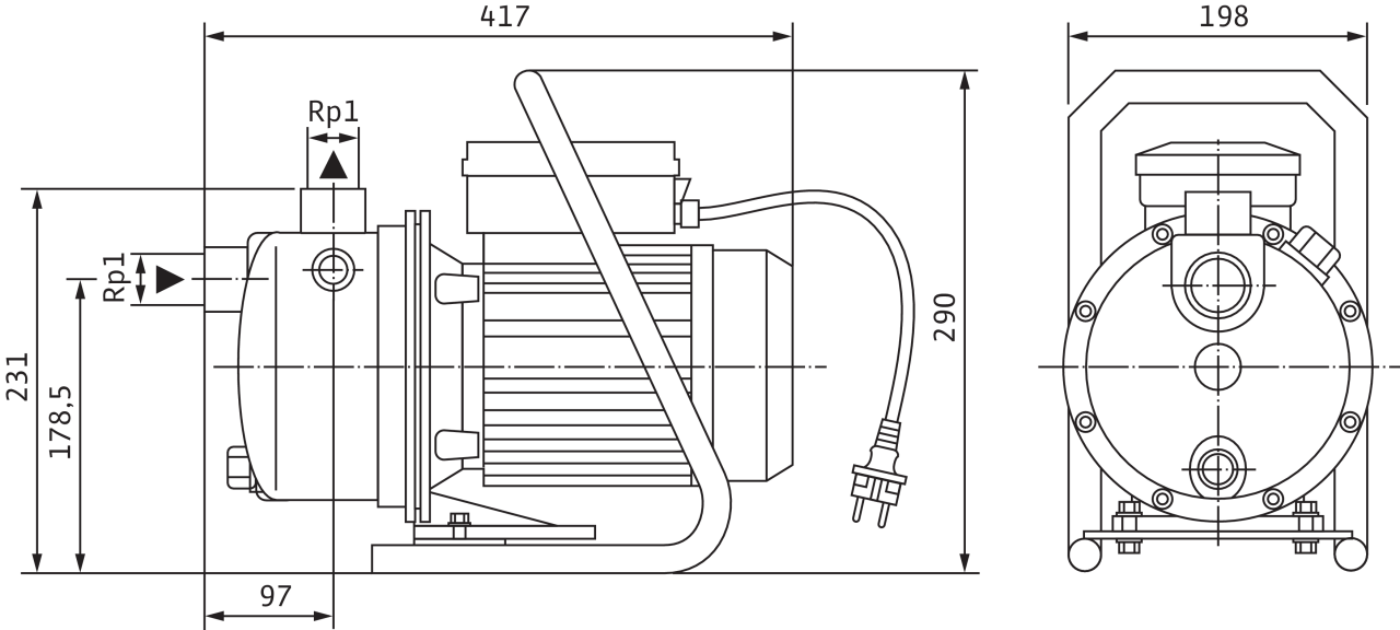 Переносной самовсасывающий одноступенчатый горизонтальный струйный насос для перекачивания воды в режиме всасывания и подвода. Напрямую присоединенный фланцами электродвигатель однофазного или трехфазного тока; в исполнении для однофазного тока со встроенным термическим защитным выключателем электродвигателя и конденсатором, а также отдельным выключателем ВКЛ./ВЫКЛ. Насос готов к подключению и включает в себя несущую раму и соединительный кабель длиной 2 м со штекером с защитным контактом; идеально подходит для переносной эксплуатации в саду или для различных увлечений. В исполнении для трехфазного тока подключение выполняется через клеммную коробку.