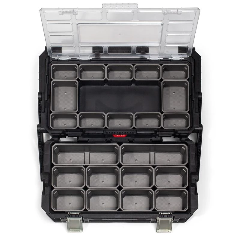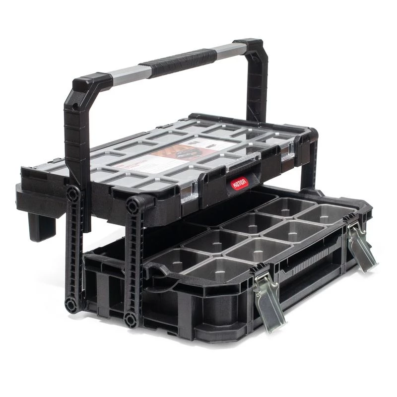 - Ящик из прочного полипропилена с двумя раздвижными органайзерами и съемными модулями для хранения инструмента, мелких деталей, фурнитуры и метизов